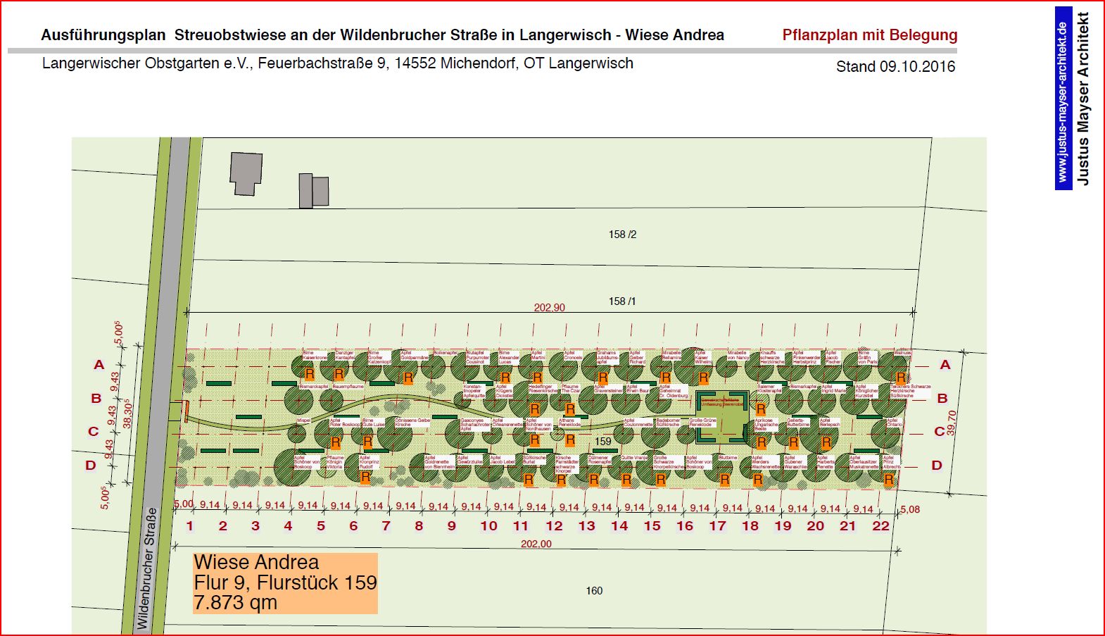 Wir haben im November 2016 auf einer ca. 0,8 ha großen seit einigen Jahren brachliegenden Fläche an der Wildenbrucher Straße in Langerwisch eine Streuobstwiese mit ca. 70 meist hochstämmigen Obstbäumen neu angelegt. Der Fläche hat der Verein vom einem Vereinsmitglied langfristig gepachtet. Aus naheliegenden Gründen heißt die Wiese bei uns "Wiese Andrea".